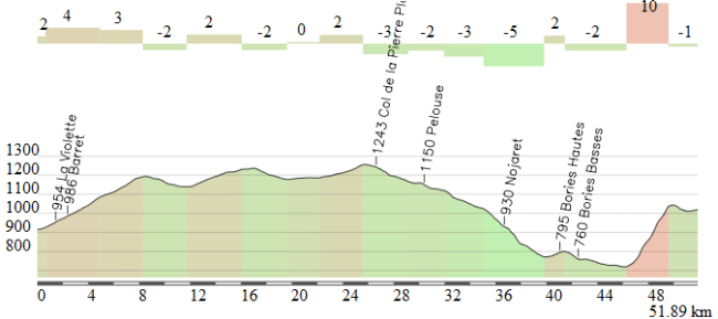 Los primeros 20 km son el tramo más llano de toda la etapa pero a partir de ahí se encadenan las tendidas cotas de Saint Barthelemy y Nonieres, con una zona de falsos llanos entremedias. Después del descenso de Nonieres se inicia la ascensión a Suc de Montivernaux, la segunda subida más dura de la jornada pero sólo debido a su longitud, ya que las pendientes son realmente suaves. La única zona de cierta dificultad está antes del cruce de Mezhilac, con 8 km cercanos al 5% de media.
