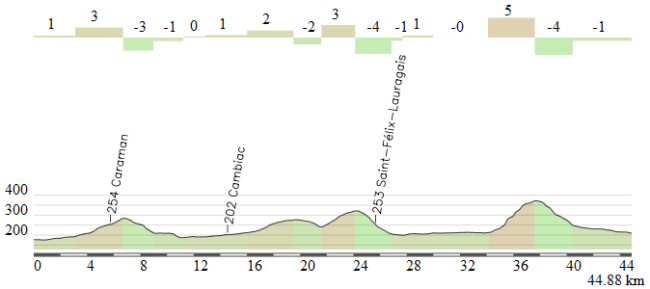 - Côte de Puylaurens, 4ª (km 125): 368 m – 4.3 km – 3.9 %