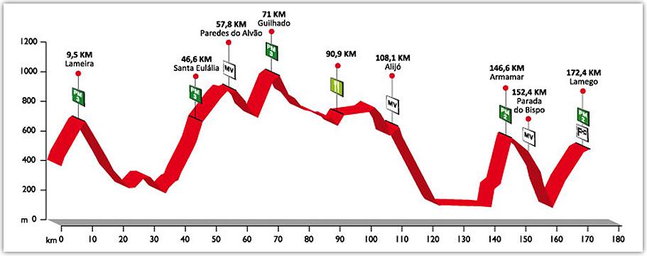 Desde la salida se sucede el terreno sinuoso y complicado, salpicado con tres puertos de tercera bastante exigentes y repechos no puntuables hasta llegar al kilómetro 140, donde da comienzo la penúltima subida del día, Armamar. Es un puerto corto, de 6 km con una elevada pendiente media y que puntúa de segunda categoría. El pelotón, si se pone un ritmo elevado, puede resquebrajarse en sus rampas, afrontando tras él un descenso que nos deja en el pie de la última montaña del día, el puerto de Lamego. Éste no entraña tanta dificultad como el anterior, siendo bastante más tendido y un poco más largo, por lo que la jornada propicia ataques en el puerto anterior. Los favoritos, si salen ofensivos y mueven la carrera de lejos, pueden provocar que haya buenas diferencias y un espectáculo ciclista de primer nivel.