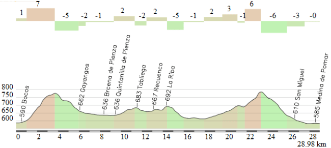 Una vez coronado el Cabrío no hay casi descenso, entrando en un terreno más o menos llano de 40 km que incluye un primer paso por Medina de Pomar. El siguiente puerto es el alto de la Varga, a 53 km de la meta, pero tiene poca dificultad. Después de la bajada, nuevo tramo llano antes de afrontar la última subida de la jornada: el Alto de Bocos. La ascensión es muy corta … pero tiene 2 km de cierta dureza, a casi el 8% de media. Es un buen lugar para que algún corredor intente sorprender al pelotón, o se seleccione el grupo de escapados.
