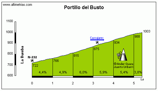 A los pocos km de iniciarse la etapa los corredores tendrán que afrontar la subida a Valmala (no puntuada). Por esta vertiente es muy suave pero es un buen lugar para que se forme la escapada del día. Terminado el descenso hay unos 20 km más sencillos hasta llegar a una zona con 2 repechos bastante duros (omitidos incompresiblemente en el perfil oficial) antes de llegar a Briviesca. Pasada esta localidad vuelve a haber un largo tramo prácticamente llano, de 25 km, hasta el inicio del Portillo del Busto: 5,4 km al 5,2 %. Se corona a 60 km de la línea de meta.