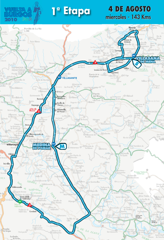 La Vuelta a Burgos 2010 se inicia con una etapa de 143 km entre Villasana de Mena y Medina de Pomar, con el pequeño puerto de Bocos a 22 km de la llegada.