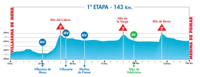 En los primeros km del recorrido se hará un bucle en torno a Villasana de Mena, afrontando el Carel (subida / bajada). Al salir de ese circuito llega la ascensión más exigente de la jornada: el Puerto del Cabrío. La organización lo ha marcado de 3ª pero tiene dureza suficiente como para ser considerada de 2ª categoría. Es muy probable que en estos primeros 40 km haya múltiples intentos de fuga.
