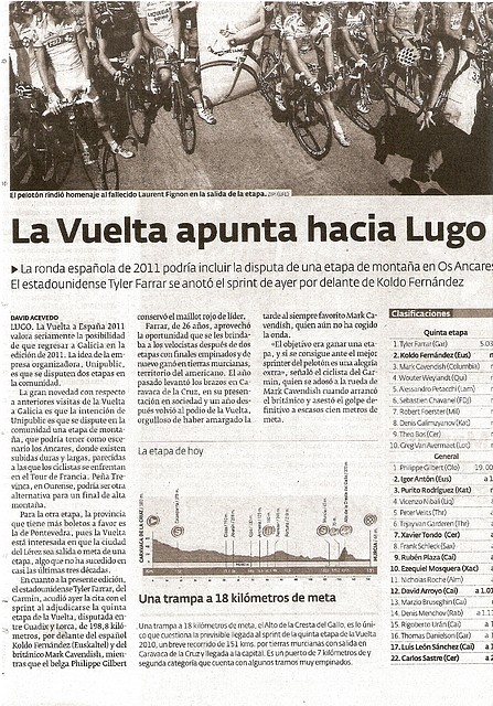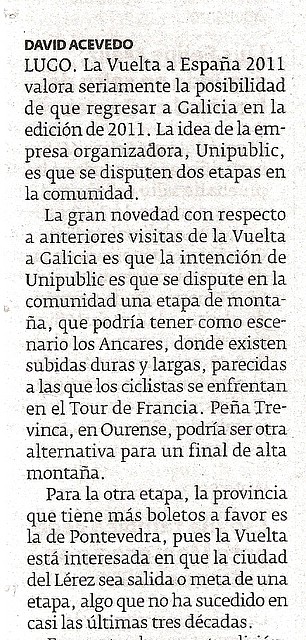En la edición impresa de hoy de El Progreso de Lugo aparece la noticia de que Unipublic se plantea usar la alta montaña gallega en la edición del año que viene. En concreto, valora la posibilidad de usar los Ancares en Lugo y Peña Trevinca (es decir, Fonte da Cova) en Ourense. Por otra parte, también se habla de una salida o llegada en Pontevedra.