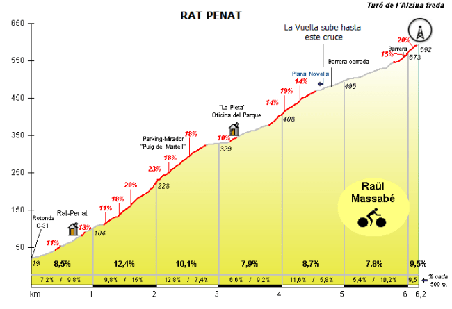 Será después de la población de Sitges, km 124 de la etapa, cuando el recorrido vuelva a endurecerse, circulando por una carretera paralela al mar y con constantes repechos, destacando el Alt de La Maladona. Pero ésto es sólo un aperitivo ya que después del descenso (de derecha a izquierda del perfil) y un nuevo repecho dará comienzo la ascensión al Rat Penat (Turo de l´Alzina Freda), un puerto hasta ahora inédito en profesionales y con tramos durísimos. Se puede comparar con el Xorret de Catí aunque es un poco más largo y con menor % medio debido a un descansillo central. En cualquier caso, también entra en las listas de rampas máximas y km más duros superados en competición, y si el ritmo es elevado podría romper completamente el pelotón.
