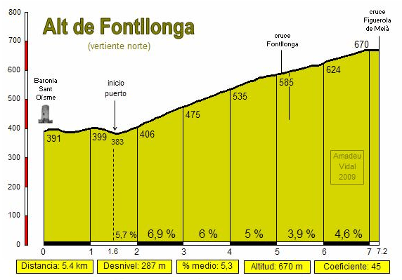 Una vez coronado, en el km 54 de la etapa, hay varios km de suave bajada antes de que la carretera vuelva a picar hacia arriba para superar el Col de Faidella, aunque por esta vertiente no pasa de ser un repecho duro (poco más de 2 km al 4,6%). El descenso de Faidella termina «oficialmente» poco después de la localidad de Isona, pero el terreno seguirá siendo bastante favorable durante unos 30 km, con sólo un repecho de cierta entidad en todo ese tramo. La situación cambiar al iniciarse el Alt de Fontllonga, una subida con suficiente dureza como para ser catalogada de 3ª.