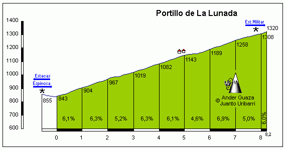 Los primeros km son de falso llano pero pasado el cruce del Santuario la carretera se pone seria, con 7 km centrales al 9,5% y destacando la temida rampa de La Huesera: 800 m por encima del 12% y con un trazado muy rectilíneo. La parte final de la ascensión es muy irregular, con tramos duros seguidos por descansillos e incluso fuertes bajadas. En este otro perfil de J.L.Soutelo Roza se puede ver el % cada 500 m.