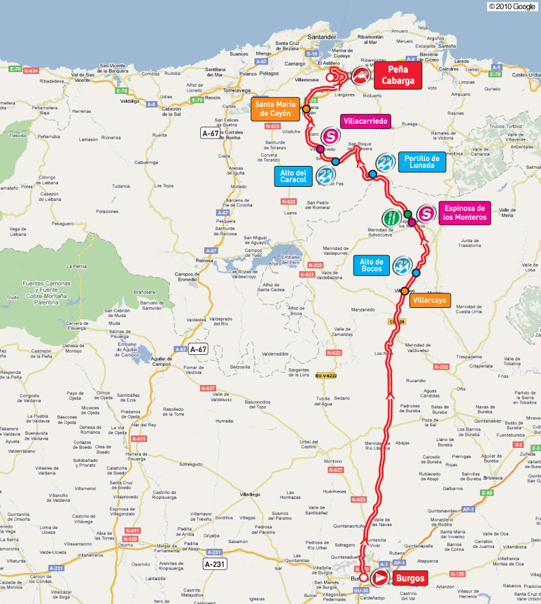 El tríptico de finales de alto se inicia con una etapa de media montaña entre Burgos y Peña Cabarga, una subida de apenas 6 km pero superando el 9% de media y con rampas durísimas. Será la segunda ocasión en que la Vuelta visite esta montaña cercana a Santander, después del ya lejano final de etapa que hubo en 1979 con victoria para Ángel López del Álamo.
