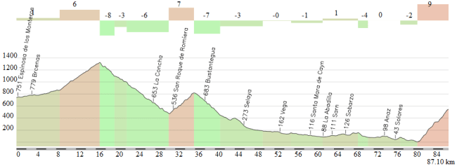 Los últimos 84 km de la etapa (a partir de Santo Domingo de la Calzada), con los pequeños puertos de Pradilla y Valmala y el llano final hasta meta.