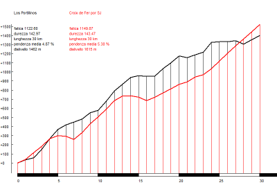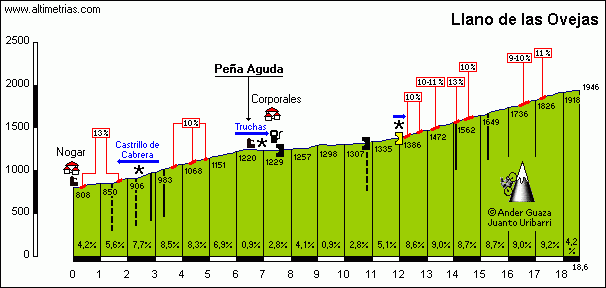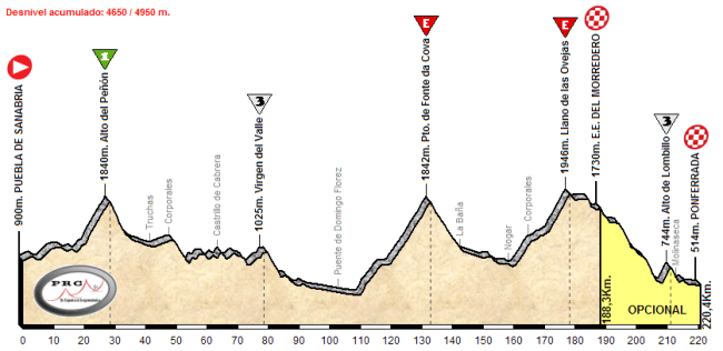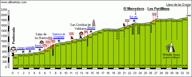 • 1.- Por PONFERRADA: es la vertiente más dura de las dos, ya que acumula un enorme desnivel (1500 m aprox.) en sus 33 km de subida, pero además tiene tramos durísimos como los 3 km al 10,5% que hay tras pasar Salas de los Barrios. Su dureza ya ha quedado patente siempre que se ha visto la subida al Morredero, y eso que no se llegaba arriba del todo, pero es evidente que puede romper la carera si hay ritmo. Su mayor pega es que no existen puertos duros que poner antes de él. Otro perfil de la subida, hasta Los Portillinos, y el ascenso completo hasta Llano de las Ovejas, con fotos.