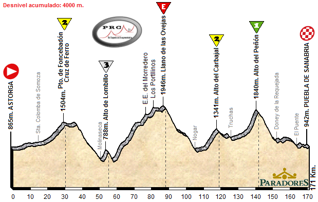 De salida se afronta un terreno quebrado hasta la base del Peñón, un primera duro que destaca por sus largas rectas con pendientes cercanas al 10%. Tras su bajada y un terreno algo más sencillo, se entra en una carretera muy característica en la zona, la que transcurre por Castrillo de Cabrera y la ermita de la Virgen del Valle. Durante esos 25Km. solo se sube un puerto puntuable, pero el llano literalmente no existe, pues la carretera es un continuo sube y baja que no da respiro. Hasta este momento, seguramente se haya formado una escapada de hombres fuertes y se habrá acumulado ya cansancio en las piernas.