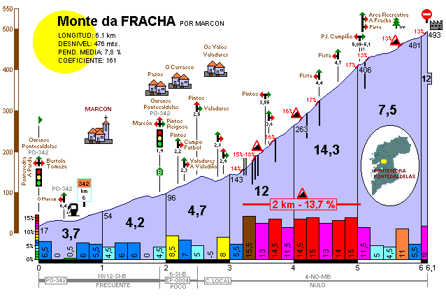 El último puerto de la etapa y el que nos animó a hacer esta entrada es el Monte da Fracha, ya que se encuentra a las afueras de Pontevedra (se corona a unos 12Km. de meta). Además creemos que puede ser muy del gusto de la organización de La Vuelta, pues es un puerto corto pero con altísimas pendientes, cerca de una ciudad tan importante como Pontevedra (seguramente se llene de público) y con una bajada por buenas carreteras.