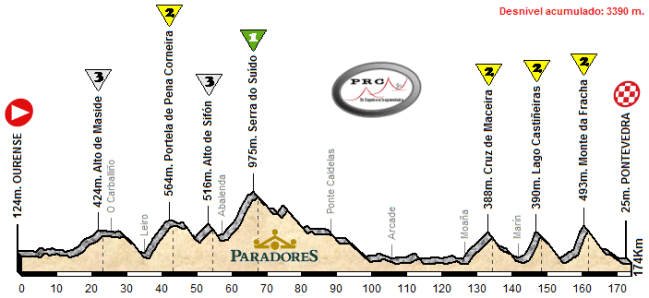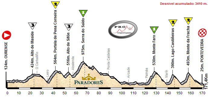 La etapa propuesta arranca en Ourense, la ciudad de las Burgas, para encarar en su primera mitad el escabroso terreno de las comarcas de O Carballiño y Avión. Tras varias dificultades menores, en el Km. 70 se afronta el puerto más duro de la jornada, la ascensión a la Serra do Suído, que esconde rampas del 16% entre una sucesión de bellas curvas de herradura. Posiblemente con la fuga del día ya conformada, el pelotón disfrutará de 60km muy favorables hasta Moaña antes de encarar un encadenado que sin duda deparará un bello final de etapa.