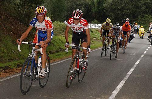 Luis Perez y Carlos Sastre dejando a sus compañeros de escapada en las rampas del Fito en 2003. Foto Unipublic.
