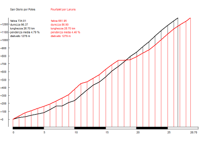Para realizar la comparativa con otro puerto famoso, hemos optado por el Portalet por Laruns, que es muy conocido a nivel cicloturista gracias a ser parte de la Quebrantahuesos. En la gráfica se observa la continuidad de la parte final de San Glorio (16,7 Km. al 6,2%) comparada con el puerto francés, que cuenta con algunos descansos.
