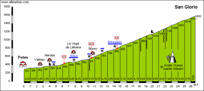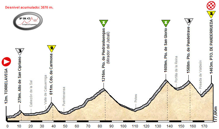 Tras una larga y suave bajada hasta Potes comienza el puerto protagonista de la entrada. Si bien su cima se encuentra a 39 km. de meta, estos no son nada sencillos, con San Glorio siendo el único puerto realmente duro de la etapa, donde hacer daño y buscar la debilidad de los rivales. Tras coronarlo, una corta bajada nos deja en Portilla de la Reina y tras girar a la derecha se sube la vertiente suave de Pandetrave, con 5 Km. de falsos llanos antes de 5 Km. finales al 4,7%. Su bajada, muy técnica, nos adentra en el corazón de los Picos de Europa leoneses, el valle de Valdeón, de donde parte la subida final: Panderrueda. Sus primeros 6,5 km. están en torno al 5-6%, endureciéndose en su parte final con 2 km. al 8%, para un total de 8,5 km al 6%, siendo un buen 2ª.