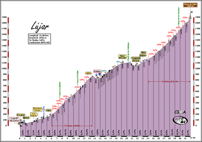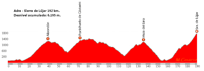 Por último, un auténtico tappone rondando los 6.000 m. de desnivel acumulado en menos de 200 km. Nuevamente partimos desde Adra, pasamos por el puerto de Albondón, largo y constante, por el Portichuelo de Cástaras y el pestoso tramo de falso llano hasta Trevélez, su eterno descenso hasta Órgiva y, finalmente por el Haza del Lino (desde el río Guadalfeo), todos ellos puertos de primerísima categoría, para provocar un buen desgaste antes de encarar el ascenso final.
