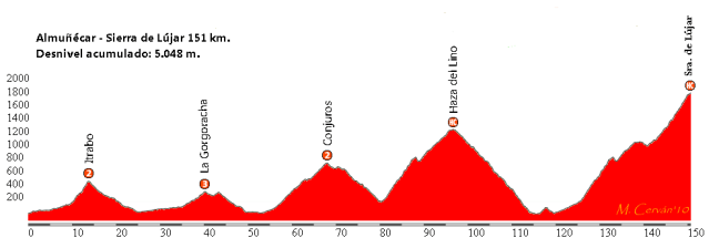 Tomando como localidad de inicio Almuñécar, podemos diseñar una etapa de unos 150 km. y más de 5.000 m. de desnivel sin necesidad de filigranas. La dureza aumenta progresivamente hasta que un primer paso por Rubite y el Haza del Lino dejen reducido el pelotón de cara al ascenso final.