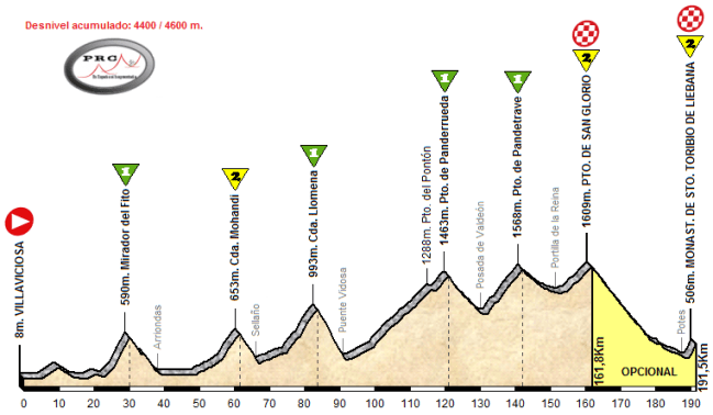 La otra alternativa es continuar hacia Potes por la larga y complicada bajada (al menos en su parte alta) de San Glorio. Allí la puntilla a la etapa la dará un clásico del Circuito Montañés, la corta pero empinadísima subida al Monasterio de Santo Toribio de Liebana, un verdadero muro con un kilómetro cercano al 12% que seguro se atraganta tras el maratón de puertos haciendo que los corredores crucen de uno en uno la linea de meta. Sin embargo, pese al bonito final, la parte negativa es que se alejan el resto de puertos con lo que es menos probable ver movimientos importantes en ellos.