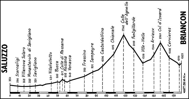 Si las anteriores llegaban más o menos pronto y con la clasificación abierta, esta era la última etapa de montaña antes de la dura CRI final (con Montgenevre y Sestriere) que decidiría el Giro, y la nómina de favoritos estaba muy reducida. Se llegaba con la clasificación muy apretada (Casagrande, Garzelli, Simoni y Belli en 1’11») y tenía un recorrido espectacular, con el enorme coloso del Agnello antes del mítico Izoard, dos especiales de paso enlazados, para terminar en el clásico repecho final por las calles de Briançon.