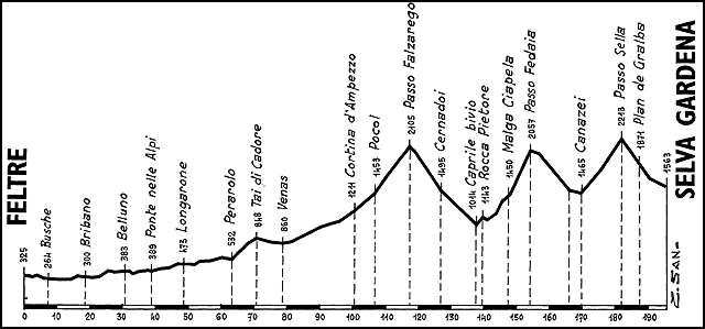 Esta etapa es una gran muestra de como utilizar los puertos en su máximo potencial sin necesidad de abusar de la dureza. El encadenado final es casi perfecto, no solo por la falta de llano sino por las características de cada puerto: Falzarego, puerto largo de desgaste; la terrible Marmolada para romper el pelotón; y para rematar el Passo Sella, exigente pero menos que el anterior. Y final justo tras la bajada del último puerto.