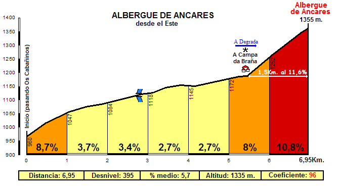 Presentamos el perfil y mapa de situación de la subida al Albergue de Ancares, con un terrible tramo final de 1,5 Km. al 11,6% que creímos muy del gusto de Unipublic o la prensa, pero que permite hacer grandísimas etapas de montaña con el Pto. de Ancares como protagonista. Esta sería nuestra opción para acabar la etapa en la provincia de Lugo.
