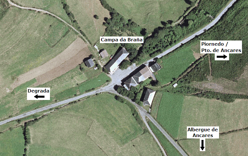 Este es el cruce que da acceso al Albergue de Ancares, y da la posibilidad de desviar vehículos hacia Degrada de forma que no ocupen espacio en la cima, o incluso usar el pequeño espacio del cruce o alguno de los prados de siega colindantes con él.