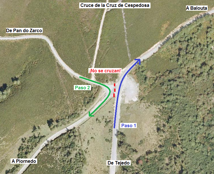 Puede parecer por el plano que existiría el problema de cruces de corredores, pero eso no es así, como demuestra la siguiente foto aérea del cruce de la Cruz de la Cespedosa. De hecho, serviría para hacer un by-pass de vehículos si fuera necesario, y que de esa forma no tuvieran que subir por Pan do Zarco y pudieran dirigirse directamente a la zona de meta.