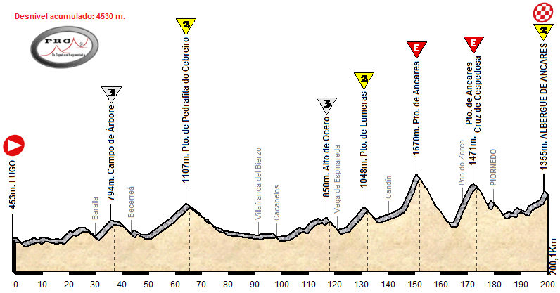 Comentario: etapa más larga que destaca por el encadenado perfecto de las durísimas rampas de Ancares por Tejedo y Pan do Zarco. Tiene la desventaja de que tal como se usa el Pto. de Ancares, deja de ser un coloso para convertirse en dos subidas no muy largas de muchísima pendiente… ya que la subida por Pan do Zarco está «recortada» por arriba y por abajo.