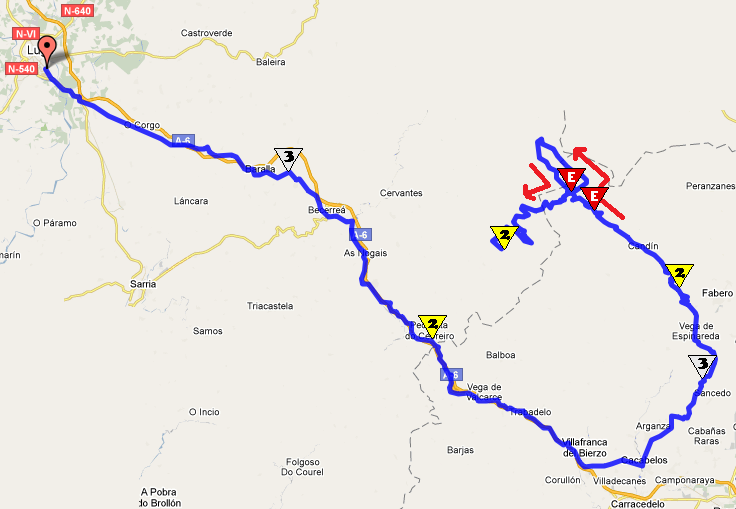 Comentario: la principal ventaja de esta etapa es que se sube el Pto. de Ancares completo, aumentando de esta forma su dureza, claro. Además, se repite el gran encadenado de puertos de la primera etapa. El final tiene dos opciones, Vega de Espinareda o Fabero, la primera quizá más turística, bonita y algo más cerca, y la segunda de mayor tamaño y con una llegada que pica ligeramente hacia arriba.