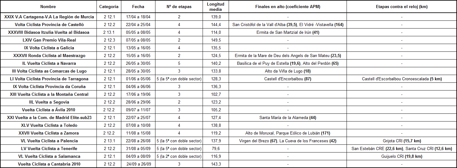 A lo largo de este año, desde nuestro blog hemos analizado los recorridos de diferentes carreras, y también comparamos en su día los de las tres grandes vueltas. Mediante la entrada de hoy, haremos un análisis somero de las “vueltas cortas” que se han disputado en territorio español durante 2010 en las categorías de élite-pro, élite y sub-23. Dejamos fuera las de juveniles.