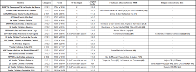 | Nombre | Categoría | Fecha | Nº de etapas | Longitud media |