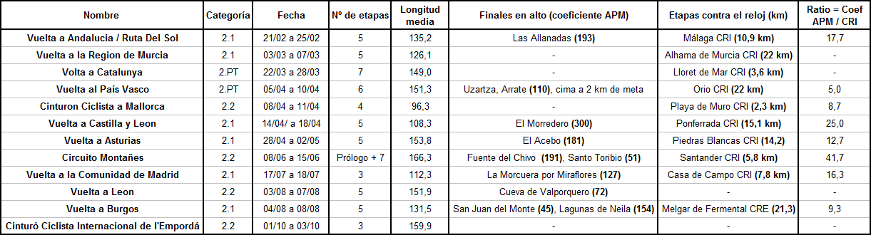 Si nos centramos en las etapas con final en alto, vemos que hay un total de 12, de diferentes tipos, destacando a principio de temporada las subidas cortas de gran pendiente. A lo largo de la temporada, los de mayor dureza fueron el Vidré-Vistabella en la Volta a Castelló y el parque Eólico de Lubián en la Vuelta a Zamora con 164 y 171 de coeficiente APM respectivamente. De las veinte vueltas estudiadas, nueve prescindieron tanto de los finales en alto como de las contra el reloj. Esta estructura, recompensa a los equipos y ciclistas con mejor visión de carrera, lo que en las frecuentes etapas de media montaña sin final en alto se traduce en una invitación al ciclismo ofensivo, que tanto engancha a los aficionados y tan poco vemos en pruebas profesionales.