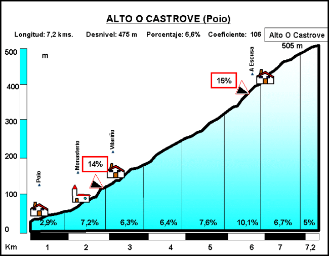 Monte Castrove se corona a unos 17,5 Km. de meta, pero de ellos solo 7 son llanos, con lo cual los ataques que fructifiquen en él tienen muchas opciones de llegar a meta con ventaja.