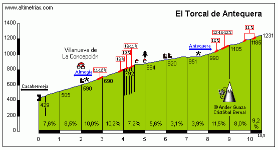 De nuevo no entendemos por qué no se incluye el Torcal como puerto decisivo. En 2009, la última etapa también terminaba en Antequera, y presentaba, como nosotros proponemos, la subida al Torcal como puerto decisivo cerca de la meta. Y resultó todo un éxito, jugándose la etapa y la general en sus rampas y con emoción hasta el último momento por saber quien se llevaría el gato al agua. Probablemente la mejor etapa de esta carrera en mucho tiempo. Por eso nos volvemos a preguntar, ¿por qué no aprovechar lo que funcionó en el pasado?