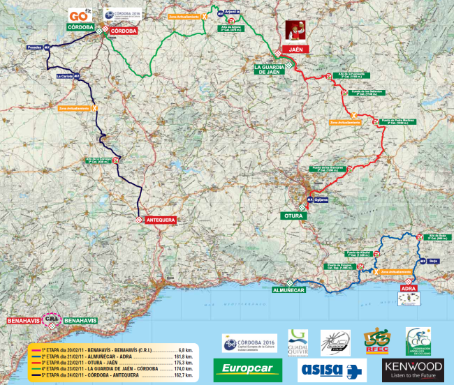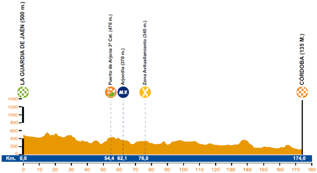Al 4º día de carrera llega la primera etapa llana, con salida en La Guardia de Jaén y llegada en Córdoba capital después de 174 km de recorrido. El terreno levemente quebrado durante los primeros 140 km no debería ser impedimento para una llegada al sprint.