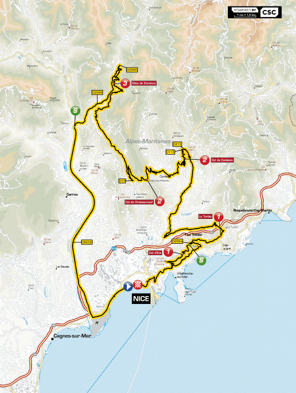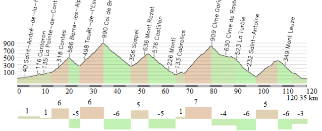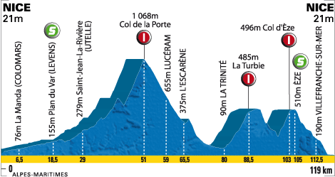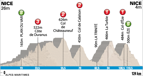 Etapa alternativa manteniendo salidas y llegada y el corto kilometraje, con Colla Donna (2) - Braus (1) - Castillon (3) - Madone (1) - Eze (2)