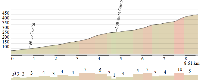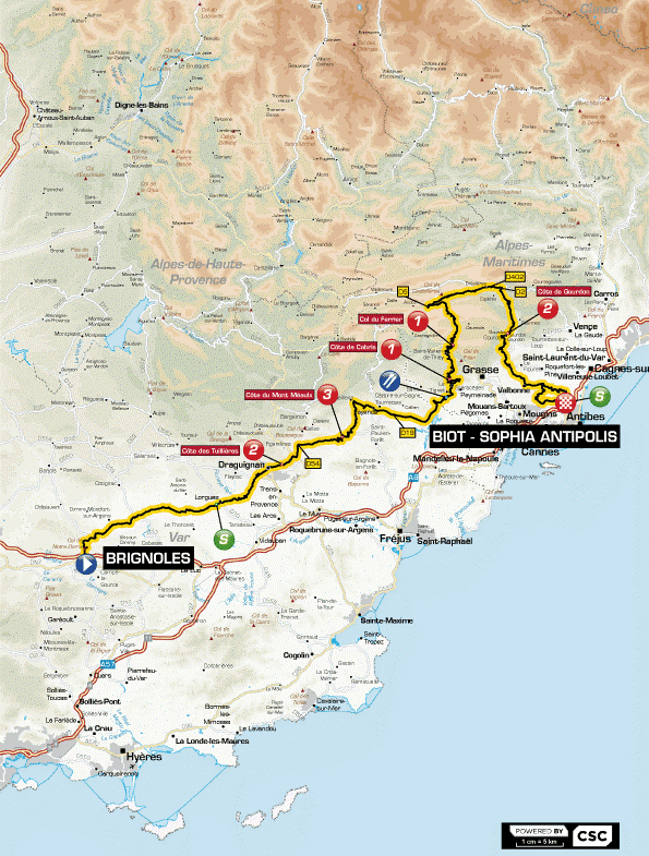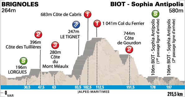 La parte inicial de la etapa no tiene apenas dificultades, pero pasado el km 20 se entrará en una zona rompepiernas y de constante repechos, destacando la dura Cota des Tuilleres (2,2 km al 7,8%) después de la localidad de Draguignan, en el km 47,5 de la etapa. La organización también ha marcado como puerto Mont Méaulx, aunque no pasa de ser un simple repecho. Será poco antes del km 90 cuando se inicie la parte más exigente del recorrido, con el encadenado de Cabris + el Col du Ferrier, dos subidas que casi se podrían considerar un único puerto ya que  no hay bajada intermedia. Eso si, considerándolas individualmente, como han hecho los organizadores, sería más realista ponerlas de 2ª categoría. Después de coronar Ferrier se crestea durante varios km, alcanzando incluso mayor altitud.