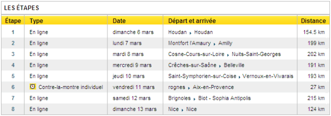 Además, la habitual contrarreloj individual que hacía de prólogo ha desaparecido, siendo sustituida por una etapa llana y a cambio incluyendo una crono cercana a los 30 km antes del fin de semana, que presenta 2 etapas de media montaña algo más suaves que en ediciones precedentes y en el caso de Biot (7ª) con los puertos muy lejos de meta, de tal modo que si las diferencias son grandes después de la disputa de la crono será difícil que haya cambios en la clasificación general.