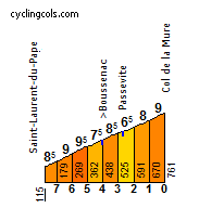 Una vez coronado, a 41,5 km de la llegada, bajada (desde el km 8,3 del perfil)  hacia Les Ollières sur Eyreiux y 12 km más o menos llanos hasta el inicio del Col de la Mure, el puerto más duro de toda la carrera con 7,6 km al 8,3 % según datos oficiales. No tiene rampas exageradas pero tampoco descansillos, y si el ritmo desde la base es elevado podría romper completamente el grupo.