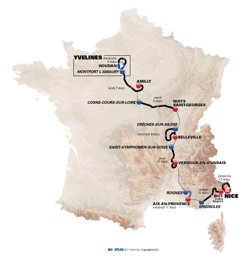 En el tema de los recorridos la París-Niza tiene una personalidad muy definida, basándose prácticamente todos los años en la media montaña y los trazados rompepiernas, con recorridos que si bien no suelen incluir puertos muy duros (con excepciones) dan muy poco respiro a los corredores. Ese tipo de terreno, que da oportunidades a corredores muy diversos y difículta el control por parte de los equipos, y el habitual mal tiempo, que hace que hasta las etapas a priori sencillas puedan resultar decisivas, son algunas de las razones que provocan que la París-Niza sea casi siempre una prueba realmente entretenida y vistosa … cuando no directamente la carrera más espectacular de la temporada, como en 2008 y 2009
