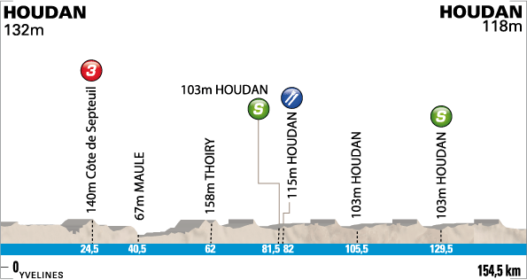 La etapa comienza con un bucle largo al norte de localidad, que incluye la pequeña cota puntuable de Septeuil, para después de un primer paso por la línea de meta dar 3 vueltas completas a un circuito de 24 km sin apenas dificultades orográficas. En resumen, una etapa corta y practicamente llana que servirá para el lucimiento de los sprinters, que salvo sorpresa se repartirán el jersey de lider y los segundos de bonificación, así como para otorgar el primer maillot de la montaña.