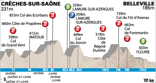 Pasada esa cota y un tramo de falso llanos se inicia la ascensión al Col du Fut d´Avenas: 11,8 km al 3,8 % (aunque la organización sólo ha contado como puerto el último tramo), con 4,9 km finales al 5,5 %. Rápida bajada y sin nada de llano dará comienzo el último puerto del día, el Col de Fontmartin: 3,6 km al 5,8 % según datos oficiales. Desde el final del descenso de Fontmartin hasta la llegada en Belleville restarán 25 km, la mayoría por un terreno relativamente quebrado y con suaves repechos (destancando el previo  a Fleurie: 2,3 km al 3,2%), pero  que va perdiendo dureza hasta terminar con 5,5 km finales totalmente llanos.