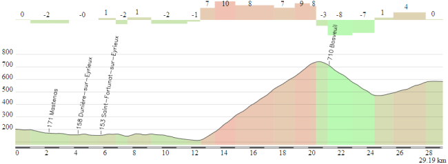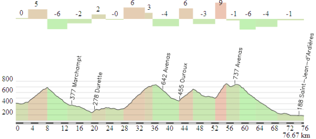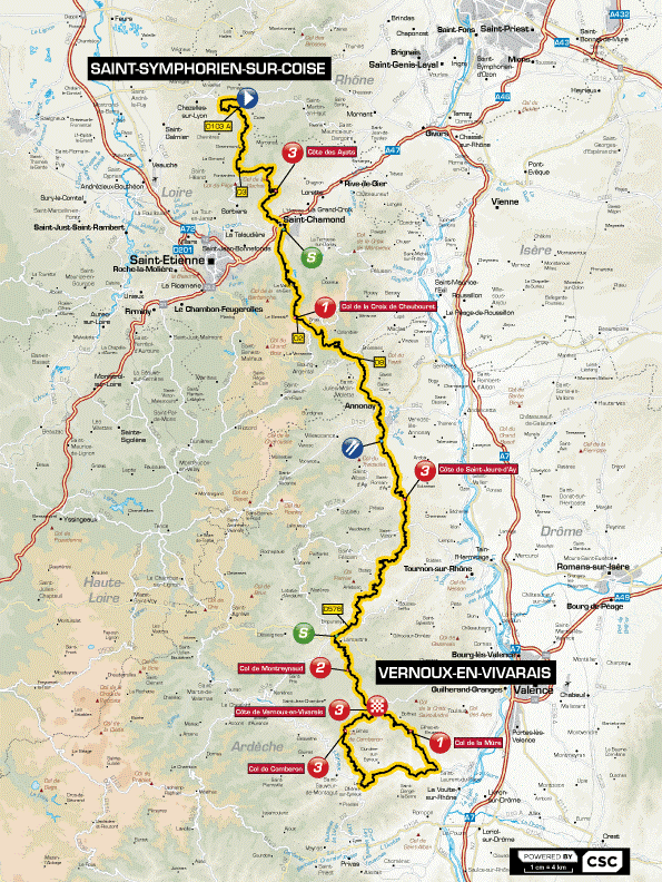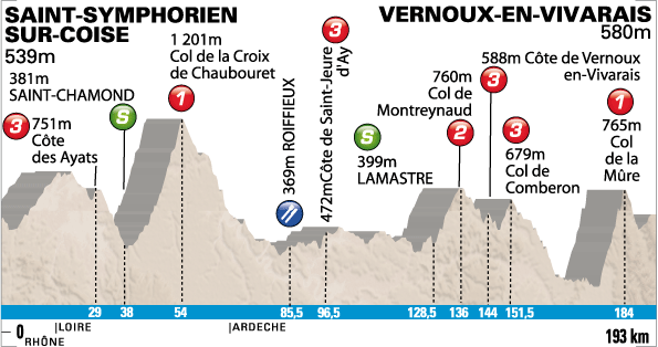 5ª ETAPA (Jueves 10 Marzo):  SAINT SYMPHORIEN SUR COISE – VERNOUX EN VIVARAINS  (193 km).  Rutómetro / Últimos 5 km