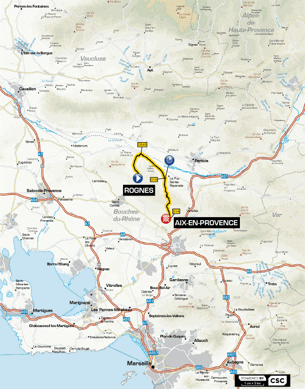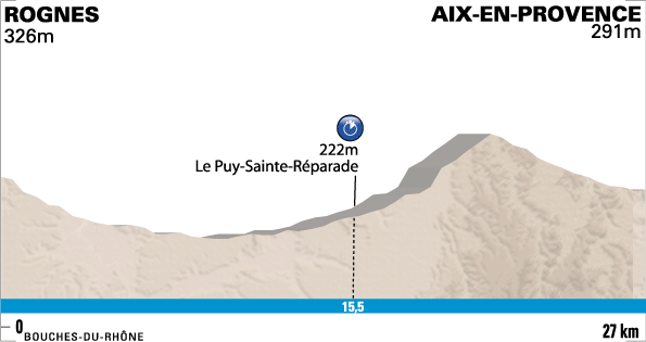 Los primeros km de la contrarreloj son de suave bajada, pero poco a poco va cambiando la tendencia hasta terminar picando hacia arriba, primero de un modo ligero pero con % más serios a partir del paso por Le Puy Sainte Réparade, localidad situada en el km 15,5 y donde se tomarán referencias, y sobre todo después de La Cride, con un tramo de 2,8 km al 5,5 % (aproximadamente). Teniendo en cuenta que han marcado como puertos subidas de mucha menor entidad, podría haber puntuado perfectamente.