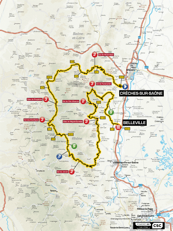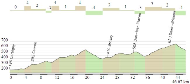 Nada mas iniciarse la etapa los corredores tendrán que afrontar las ascensiones consecutivas de La Grange du Bois y Gran Vent … aunque sorprendentemente la organización sólo ha marcado como puerto la segunda pese a tener ambas una dureza muy similar. Después de coronar, suave descenso en busca de la localidad de Saint Leger Sous la Bussiere y la siguiente cota de la jornada, el Col de la Croix d´Auterre, aunque no es puntuable. El descenso de Auterre dará paso, después de un pequeño tramo de repechos, al encadenado Propières/Echarmeux + Ecorbans + Favardy: 3 cotas sin demasiada dureza pero completamente seguidas. De hecho las bajadas intermedias son tan cortas que casi podría considerarse un único puerto.