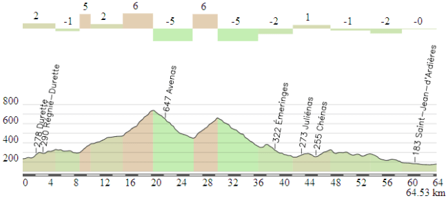 Los primeros km son prácticamente llanos, pero enseguida el terreno se complica con varios repechos y  la cota de Duranus, que se corona en el km 33,5 km de la etapa. Después de esta cota continúa el terreno «pestoso» hasta llegar a la base del Col de Chateaneuf, un puerto ya usado en esta jornada final … aunque hace 7 años y por su otra vertiente, claramente más dura.