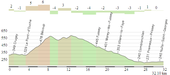 La parte final de la etapa, con la cota de Becoup, su largo descenso y los últimos 6 km llanos hasta Nuit Saint Georges.