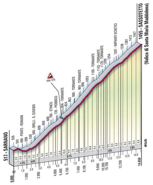 Terminado el descenso de Croce Rossa hay una unos 30 km de falso llano ascendente y pequeño repechos hasta el Valico di Rustici: 2 km cercanos al 6% de media. Rápida bajada y enseguida se llega a la localidad de Sarnano, punto de inicio del gran puerto del día, Sasso Tetto (Valico di Santa María Maddalena), que con cerca de 1000 m de desnivel y km enteros al 10% hará una buena selección a poco que el ritmo sea elevado.