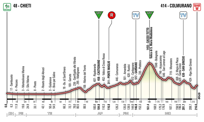 Los primeros 70 km no tienen mayores dificultades, destacando sólo la tendida subida inicial a Marmore, pero al paso por la localidad de Antrodocco se inicia la ascensión al primer puerto del día, Sella di Corno: 13,4 km cercanos al 4%. Después del suave descenso y tras unos km más o menos  llanos, que incluyen el paso por la ciudad de L ´Aquila, se afronta el siguiente puerto, Barisciano, aunque en no cuenta para la clasificación de la montaña. Superado esa ascensión hay unos 25 km prácticamente llanos por la meseta de Navelli hasta que empieza la auténtica bajada hacia Popoli,  localidad situada en el valle del Río Pescara. A partir de ahí, 30  km muy favorables para el trabajo del pelotón … hasta que al tomar un giro a la derecha cambia el terreno, entrando en la parte decisiva de la etapa.